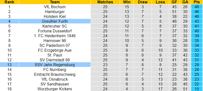 Thật vậy, nếu Jahn Regensburg vẫn phải nghĩ tới cuộc chiến trụ hạng thì mục tiêu của Furth là suất lên chơi tại Bundesliga mùa tới. Furth thậm chí từng có thời gian dẫn đầu bảng xếp hạng Bundesliga 2 mùa này.