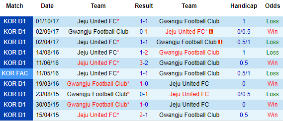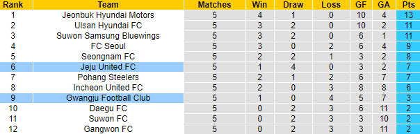 Họ vẫn đang bất bại sau 5 vòng dù rằng hòa tới 4 trận. Với 7 điểm đang có trong tay, Jeju United rộng cửa tranh chấp vị trí ở nửa trên BXH. Trong khi đó thì Gwangju thi đấu không tốt khi thua đến 4/5 vòng đã qua và kém Jeju Utd 3 bậc trên BXH.