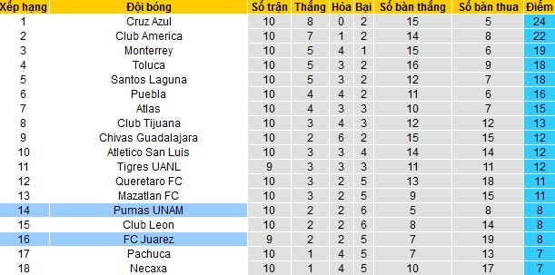 Bảng xếp hạng giải VĐQG Mexico trước vòng 11