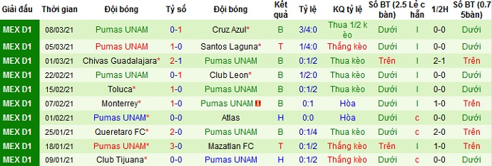 + Thống kê 10 trận gần nhất của Pumas UNAM