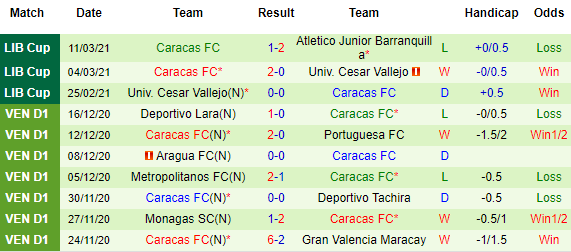 + Thống kê 10 trận gần nhất của Caracas