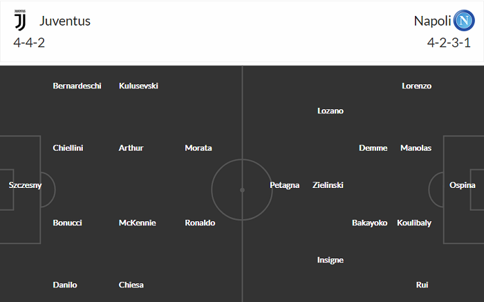 Ở trận tranh Siêu Cúp Italia 2020 này, Napoli có sự chuẩn bị về lực lượng tốt hơn đáng kể so với Juventus. Napoli chỉ thiếu vắng Fabrian Ruiz trong khi Juventus thiếu vắng một loạt cầu thủ như Merith Demiral, Paulo Dybala, Juan Cuadrado, Alex Sandro và Matthijs de Ligt.