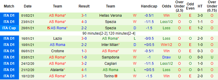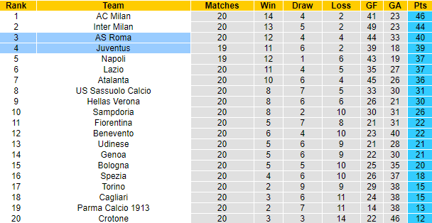 Juventus lúc này đang xếp dưới Roma 1 bậc trên bảng xếp hạng Serie A. Theo đó, Lão phu nhân đứng ở vị trí thứ 4 với 39 điểm, Roma xếp thứ 3 với 40 điểm. 2 trận đối đầu Juventus gần đây, Roma bất bại với 1 chiến thắng, 1 trận hòa và toàn thắng theo kèo châu Á.