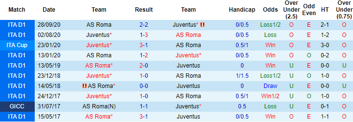 Phong độ và thống kê đối đầu Juventus vs Roma