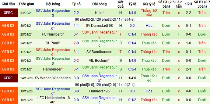 Trong 5 trận gần nhất Jahn Regensburg có được 2 trận thắng, 1 trận hòa và để thua 2 trận. Thành tích sân khách của Jahn Regensburg cũng không tệ với 2 trận thắng, 1 trận hòa và 2 trận thua trong 5 lần du đấu gần đây.