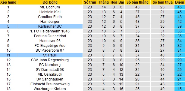 Trong khi đó St. Pauli chỉ đang đứng thứ 11 trên bảng xếp hạng với 31 điểm cũng sau 23 vòng đấu. Tuy nhiên hiện tại St. Pauli vẫn đang hơn nhóm các đội trong nhóm cầm đèn đỏ tới 10 điểm, khoảng cách được coi là khá an toàn.