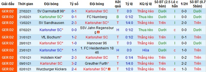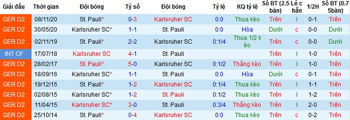 Trong 5 lần đối đầu gần nhất giữa hai đội Karlsruher đang có thành tích nhỉnh hơn đôi chút với 2 trận thắng, 2 trận hòa và 1 trận thua. Thế nhưng hiện tại St. Pauli đang có phong độ rất tốt nên có lẽ chọn cửa dưới ở trận đấu này vẫn là lựa chọn có phần hợp lý.