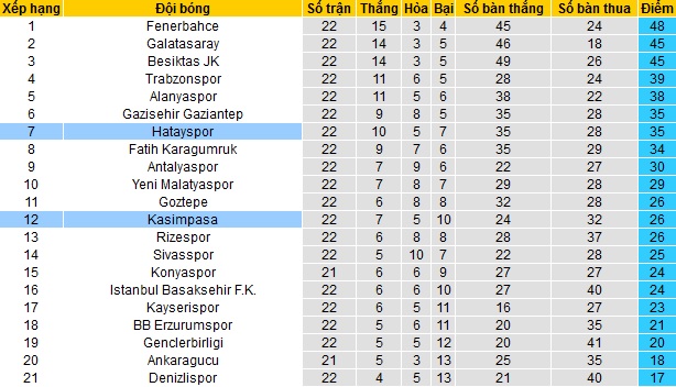 Sau 22 vòng đấu tại giải vô địch quốc gia Thổ Nhĩ Kỳ, Kasımpaşa đang đứng ở chính giữa bảng xếp hạng với 26 điểm có được. Đây cũng không phải điều quá bất ngờ khi ở mùa giải trước Kasımpaşa cũng chỉ có thể cán đích ở vị trí thứ 10.