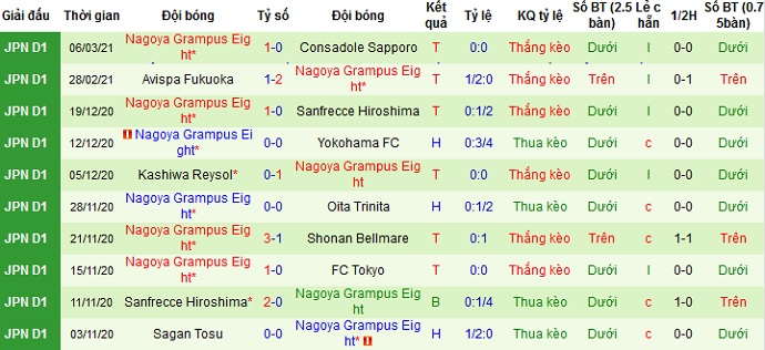 + Thống kê 10 trận gần nhất của Nagoya Grampus