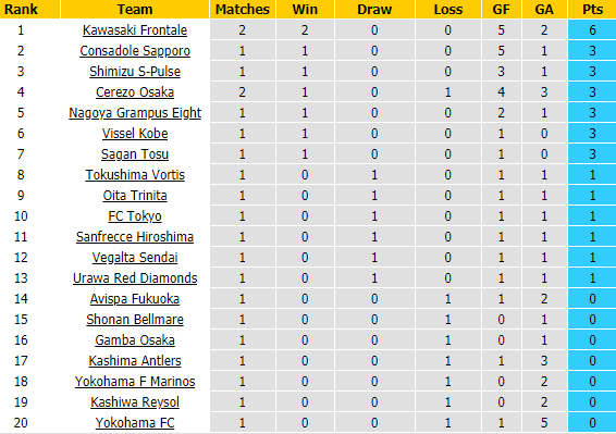BẢNG XẾP HẠNG GIẢI VĐQG NHẬT BẢN