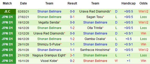 + Thống kê 10 trận gần nhất của Shonan Bellmare