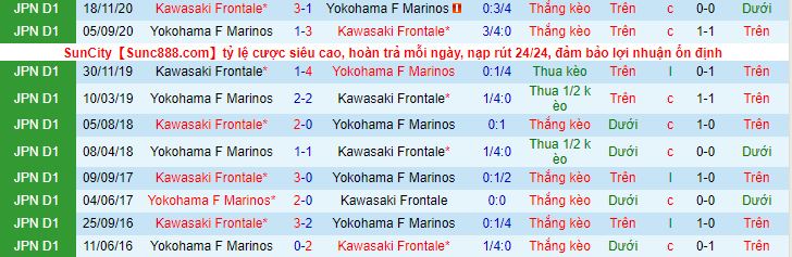+ Soi tỷ lệ kèo châu Á: Trong 5 lần đối đầu gần nhất giữa hai đội, thành tích đang nghiêng về phía Kawasaki Frontale. Đội bóng này đã giành được 3 chiến thắng, trong khi Yokohama Marinos chỉ thắng được một trận. Trên sân nhà, Kawasaki Frontale thắng kèo châu Á 4/6 trận gần nhất. Trong khi đó, Yokohama Marinos toàn thua cả 3 trận vừa qua theo cách tính này. Chọn Kawasaki Frontale!
