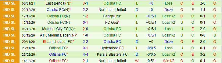 + Thống kê 10 trận gần nhất của Odisha