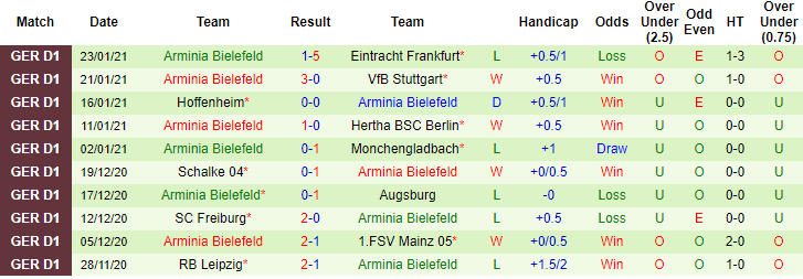 + Thống kê 10 trận gần nhất của Arminia Bielefeld
