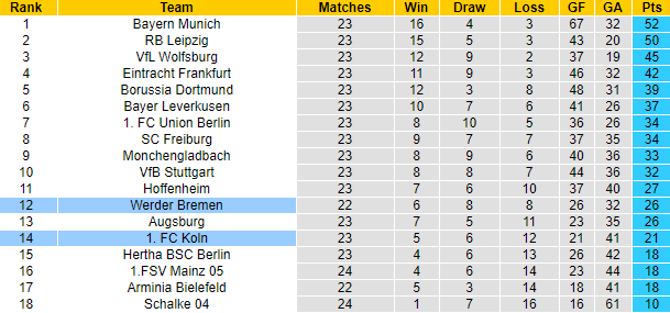Lực lượng sứt mẻ, đội hình vắng tới 7 trụ cột vì chấn thương, Koln khó hồi sinh trong tương lai gần. Ngược lại, Werder Bremen ở trận đấu sắp tới được đón chào sự trở lại của 5 cầu thủ sau chấn thương gồm Milos Veljkovic, Omer Toprak, Ludwig Augustinsson, Marco Friedl và Davie Selke. 6 trận vừa qua, Bremen bất bại 5 lần với 3 chiến thắng và 2 trận hòa.