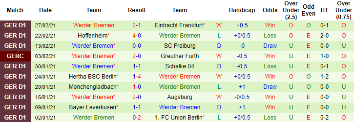 + Thống kê 10 trận gần nhất của Werder Bremen
