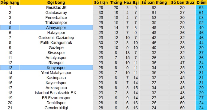 Trong khi đó Alanyaspor lại đang đứng ngay dưới nhóm các đội có suất dự cúp châu Âu ở vị trí thứ 5 với 49 điểm sau 29 vòng đấu. Thế nhưng Alanyaspor đang còn cách Top 4 tới 6 điểm cho dù họ đang thi đấu ít hơn 1 trận.