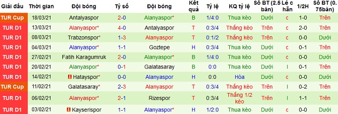 + Thống kê 10 trận gần nhất của Alanyaspor