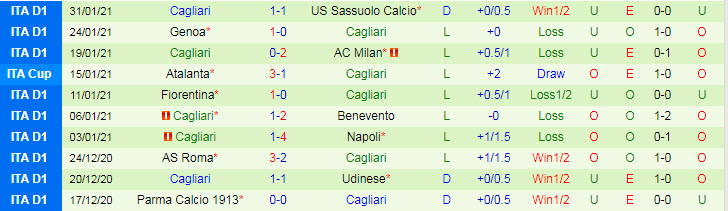 Nên nhớ, Cagliari đang trong cơn khủng hoảng về phong độ khi thua tới 7 và chỉ hòa 1 ở 8 trận gần đây tại mọi đấu trường. Tính tại giải VĐQG Italia mùa này, Cagliari là một trong những ứng viên nặng ký cho 3 suất xuống hạng. Cụ thể, họ mới thắng 3 trận, hòa 6 và thua tới 11 lần, qua đó đứng ở vị trí thứ 18/20 đội tham dự.
