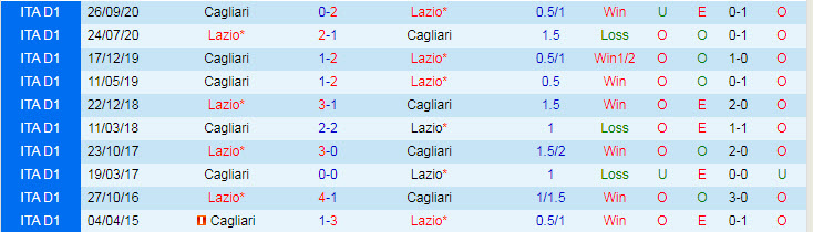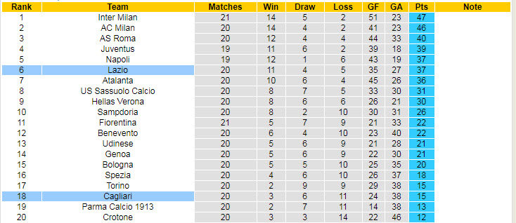 Phong độ và thống kê đối đầu Lazio - Cagliari gần đây: