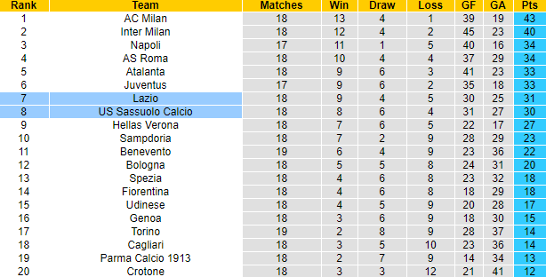 Trên bảng xếp hạng Serie A lúc này, Lazio đang xếp thứ 7 với 31 điểm sau 18 trận. Sassuolo không hề kém cạnh khi giành 30 điểm, xếp ở vị trí thứ 8. Thi đấu trên sân khách, Sassuolo luôn tự tin giành kết quả tốt nhờ lối chơi phòng ngự phản công vào phom. 14 trận xa nhà trước đó tại Serie A, Sassuolo bất bại 11 lần 7 chiến thắng và 4 trận hòa.