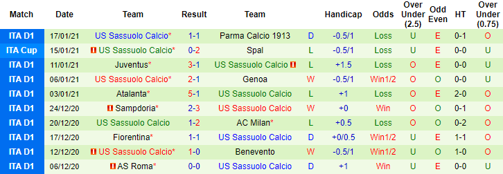 + Thống kê 10 trận gần nhất của Sassuolo