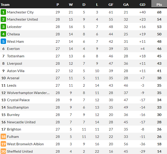 Bảng xếp hạng Ngoại hạng Anh mới nhất