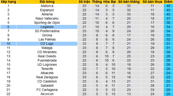 Bảng xếp hạng giải hạng nhì Tây Ban Nha vòng 23