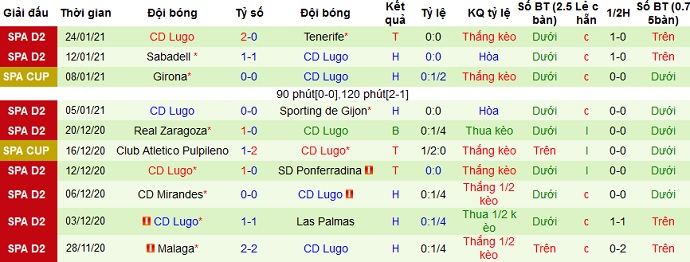 Ở 5 vòng đấu gần nhất Lugo có được 2 trận thắng, 2 trận hòa và để thua 1 trận. Thế nhưng thành tích sân khách của đội bóng lại khá tệ khi đã 7 lần du đấu gần nhất đội bóng không thắng với 4 trận hòa và 3 trận thua.
