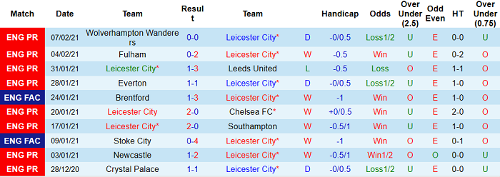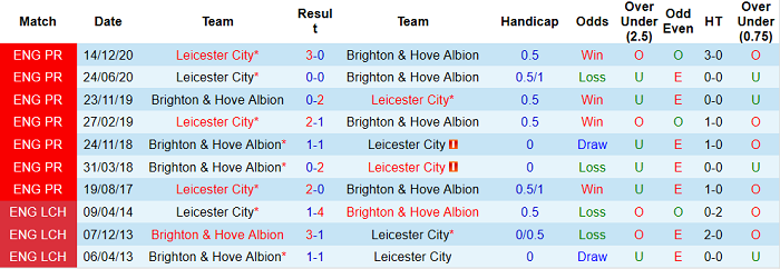 6 lần chạm trán gần nhất, Brighton thua tới 4, bao gồm cả thất bại với tỷ số 0-3 ở trận lượt đi của Ngoại hạng Anh mùa này diễn ra hồi tháng 12/2020. 4 lần so tài vừa qua với Leicester tại sân King Power thì Brighton thua tới 3.