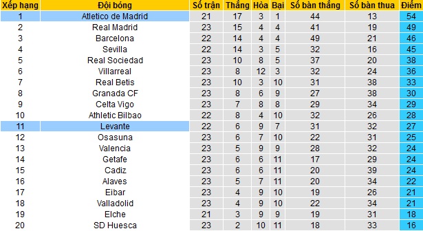 Trong khi đó Atletico Madrid vẫn đang độc chiếm ngôi đầu bảng xếp hạng La Liga với 54 điểm sau 21 vòng đấu. Hiện tại Atletico Madrid vẫn đang hơn đội nhì bảng Real Madrid tới 5 điểm, đồng thời còn thi đấu ít hơn 2 trận.