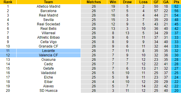 Phong độ và thống kê đối đầu Levante vs Valencia