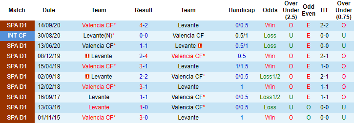 Trận đối đầu giai đoạn lượt đi La Liga mùa này, Valencia đã giành chiến thắng thuyết phục 4-2 khi tiếp đón Levante trên sân nhà. Mùa giải trước khi làm khách trên sân của Levante, Valencia cũng có 3 điểm trọn vẹn cùng chiến thắng với tỷ số tương tự.