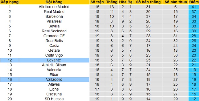 Bảng xếp hạng giải VĐQG Tây Ban Nha vòng 19