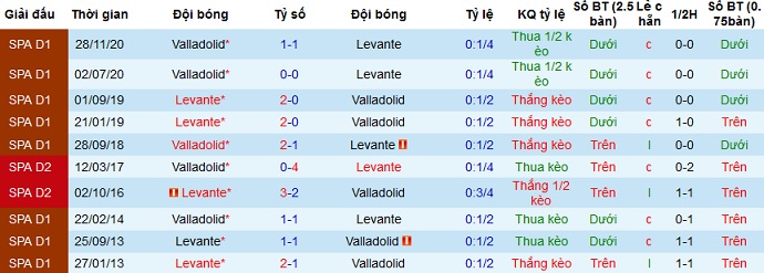 Trong giai đoạn lượt đi trên sân của Valladolid hai đội đã hòa nhau 1-1. Thế nhưng ở mùa trước trên sân của Levante đội chủ nhà đã giành chiến thắng với tỷ số 2-0. Với phong độ sân nhà đang rất cao của Levante như hiện tại, có lẽ chọn cửa trên vẫn là sự lựa chọn hợp lý hơn.