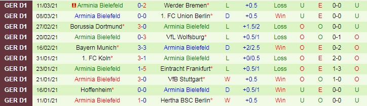 + Thống kê 10 trận gần nhất của Bielefeld