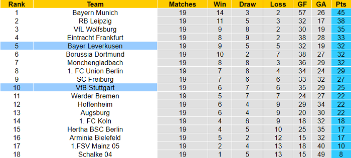 Bayer Leverkusen rõ ràng không có được thành tích tốt trong thời gian vừa qua. Họ không thắng 6/7 vòng gần nhất. Hệ quả: từ việc có thể cạnh tranh Đĩa bạc với Bayern Munich và Leipzig, Leverkusen rơi xuống vị trí thứ 5 sau vòng 19.