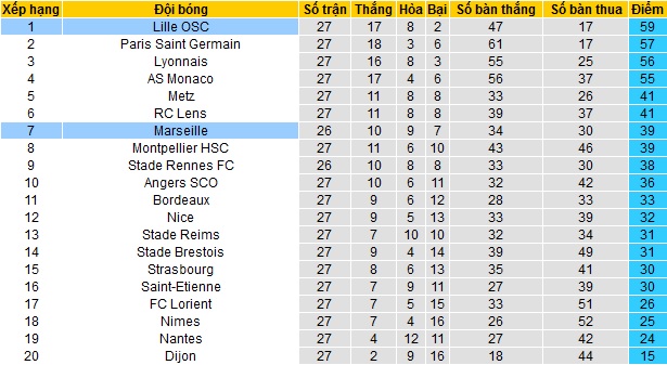 Bảng xếp hạng Ligue 1 trước vòng 28