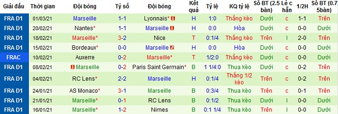Ở 5 trận gần nhất Marseille vẫn đang bất bại với 2 trận thắng và 3 trận hòa, bao gồm cả trận thắng tại cúp quốc gia. Trên sân khách Marseille cũng đang bất bại 4 trận du đấu gần nhất nhưng chỉ thắng được 1 trận ở đấu trường cúp quốc gia, hòa cả 3 trận còn lại.