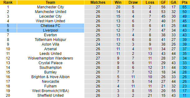 Hiện West Ham đang xếp thứ 4 với 45 điểm, Chelsea xếp thứ 5 với 44 điểm và Liverpool xếp thứ 6 với 43 điểm. Động lực chiến thắng rất rõ ràng, Liverpool có thêm sự tự tin nhờ sự ủng hộ của lịch sử. 4 lần chạm trán Chelsea gần đây trong khuôn khổ Premier League, The Kop toàn thắng, xé lưới đối thủ 11 lần.