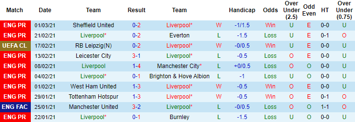 + Thống kê 10 trận gần nhất của Liverpool