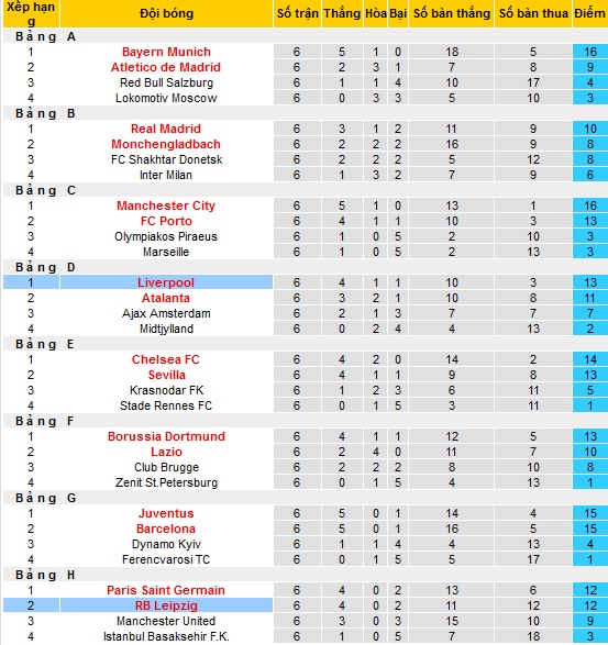 Bảng xếp cúp C1 châu Âu giai đoạn vòng bảng