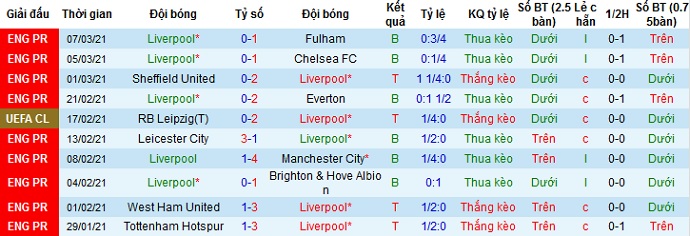 + Thống kê 10 trận gần nhất của Liverpool