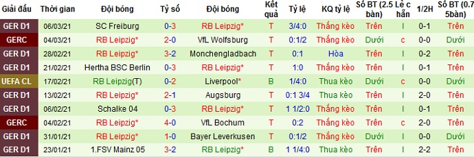 + Thống kê 10 trận gần nhất của RB Leipzig