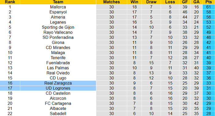 Nhờ 6/9 điểm ấy, Zaragoza thoát khỏi nhóm ‘cầm đèn đỏ’. Khoảng cách giữa họ và nhóm này sau vòng 30 đã được nới rộng lên thành 4 điểm. 4 điểm chưa phải khoảng cách an toàn nhưng cũng tiếp thêm nhiều sự tự tin cho Zaragoza trong cuộc chiến trụ hạng.