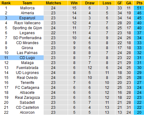 Tính ra, Espanyol là đội ghi được nhiều bàn thắng nhất giải với 34 lần chọc thủng lưới đối phương qua 23 trận, đạt hiệu suất khá cao so với mặt bằng chung của giải. Trong khi đó, phía đối diện là Lugo khá nhạt nhòa với vị trí thứ 11 hiện nay của họ.