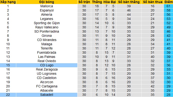 Trong khi đó Sabadell còn đang đứng cuối bảng xếp hạng khi chỉ có được 28 điểm cũng sau 30 vòng đã đấu. Tuy nhiên Sabadell chỉ kém 2 đội đứng ngay trên đúng 1 điểm và đang còn cách nhóm các đội trụ hạng có 3 điểm.