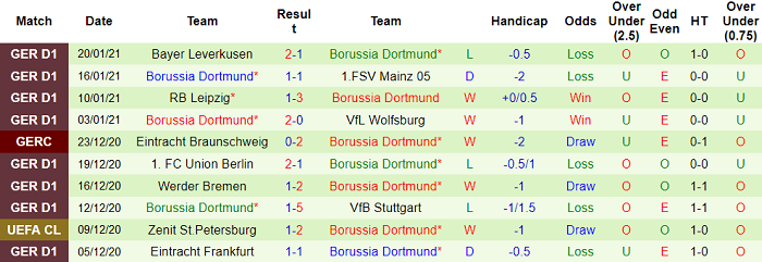 - Thống kê 10 trận gần nhất của Dortmund