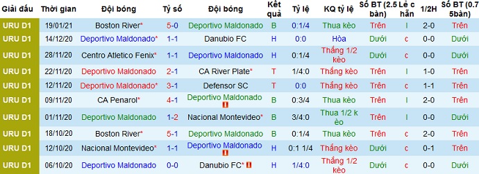 Tính cả giai đoạn trước, trong 5 trận gần nhất Maldonado có được 2 trận thắng, 2 trận hòa trước khi để thua đậm Boston River với tỷ số 0-5. Trên sân nhà Maldonado cũng đang có được 2 trận thắng, 2 trận hòa và để thua 1 trận ở 5 trận gần nhất tại đây.