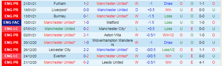 + Thống kê 10 trận gần nhất của Man United